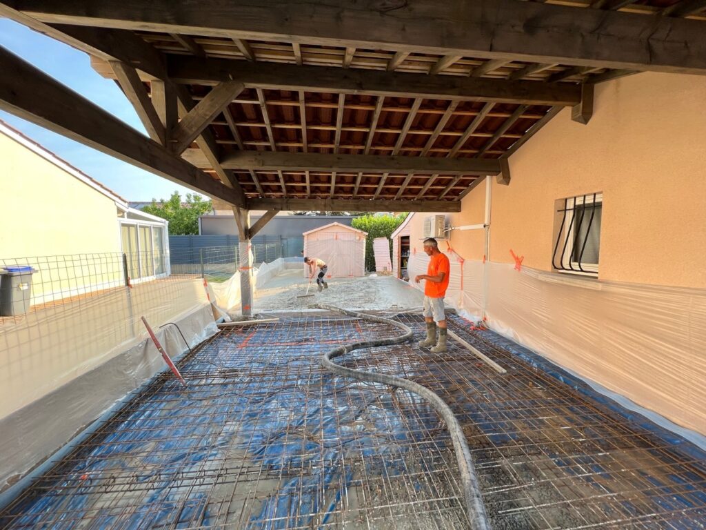 Le béton est coulé puis réparti uniformément sur la surface à traiter, en respectant les pentes et épaisseurs nécessaires.